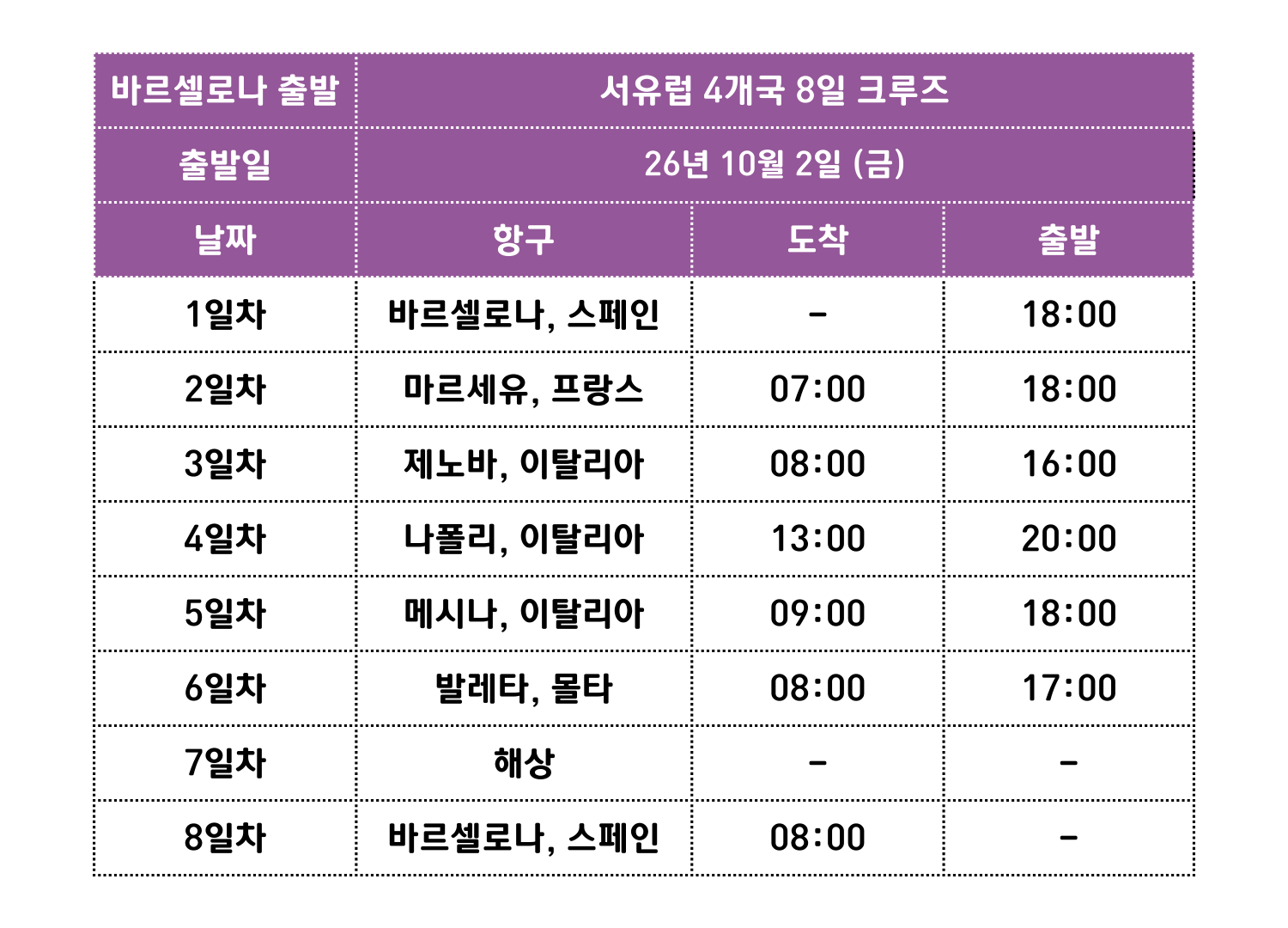26년 9월 18일ㅣ26년 10월 2일 바르셀로나 출발 MSC 월드유로파 이태리/프랑스/스페인/몰타 서부지중해 크루즈여행 자유여행