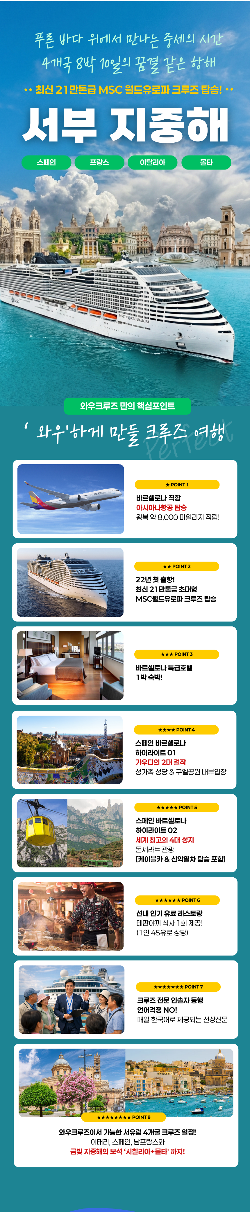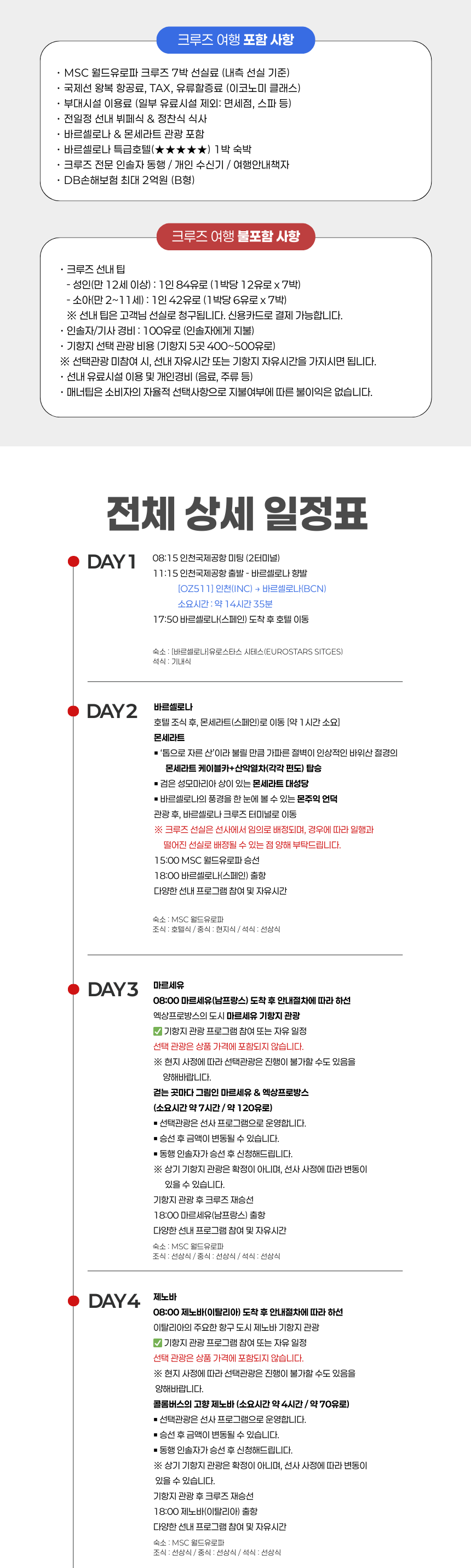 항공은 아시아나항공 직항으로 인천–바르셀로나를 편안하게 이동하며, 크루즈 여행의 시작부터 끝까지 안정적인 일정으로 준비되어 있습니다. 바르셀로나에서 승선한 뒤에는 호텔을 옮겨 다니는 번거로움 없이 하나의 객실에서 편안하게 이동하며 여러 도시를 여행하는 크루즈만의 장점을 경험하실 수 있습니다.