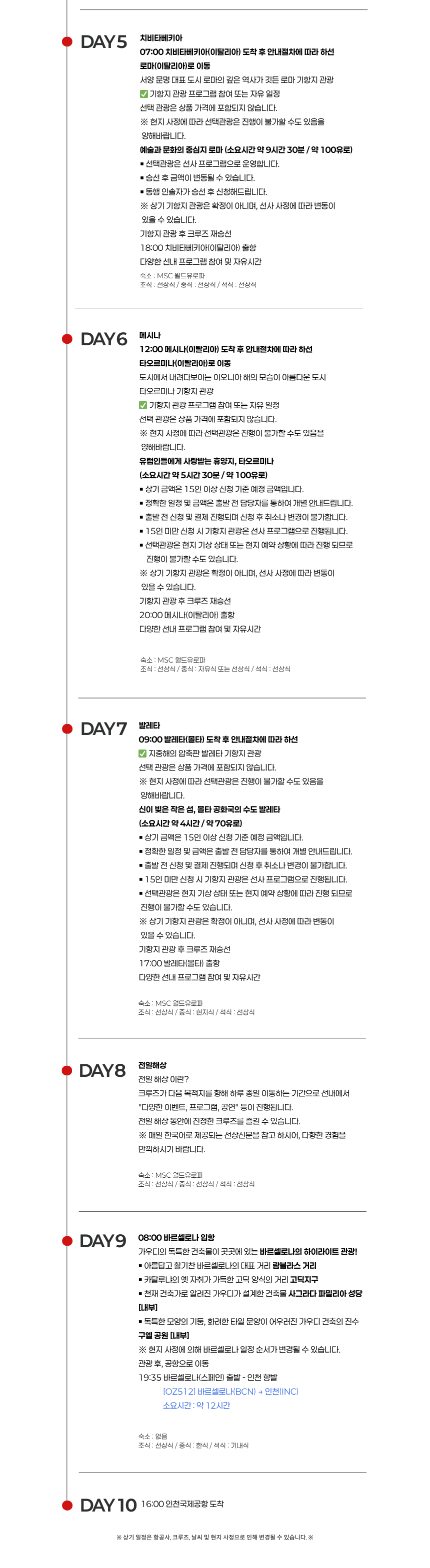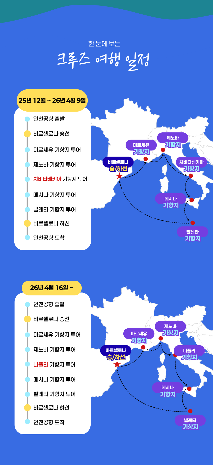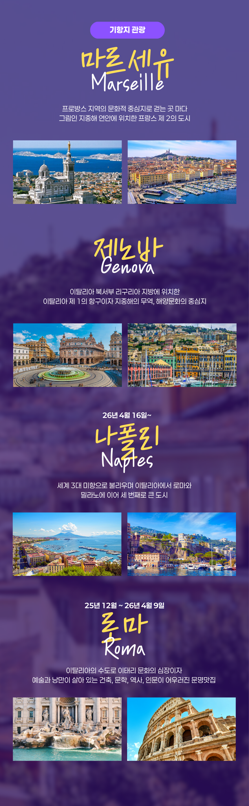 또 하나의 특징은 매달 출발하는 일정이라는 점입니다. 특정 날짜에 맞춰 급하게 준비할 필요 없이 여행 계획에 맞춰 여유롭게 선택하실 수 있으며, 계절에 따라 조금씩 달라지는 지중해의 분위기도 느껴보실 수 있습니다. 봄에는 온화한 날씨와 꽃이 피는 항구 도시를, 여름에는 활기찬 지중해의 바다와 휴양 분위기를, 가을에는 한층 여유로운 유럽의 풍경을 만나게 됩니다.