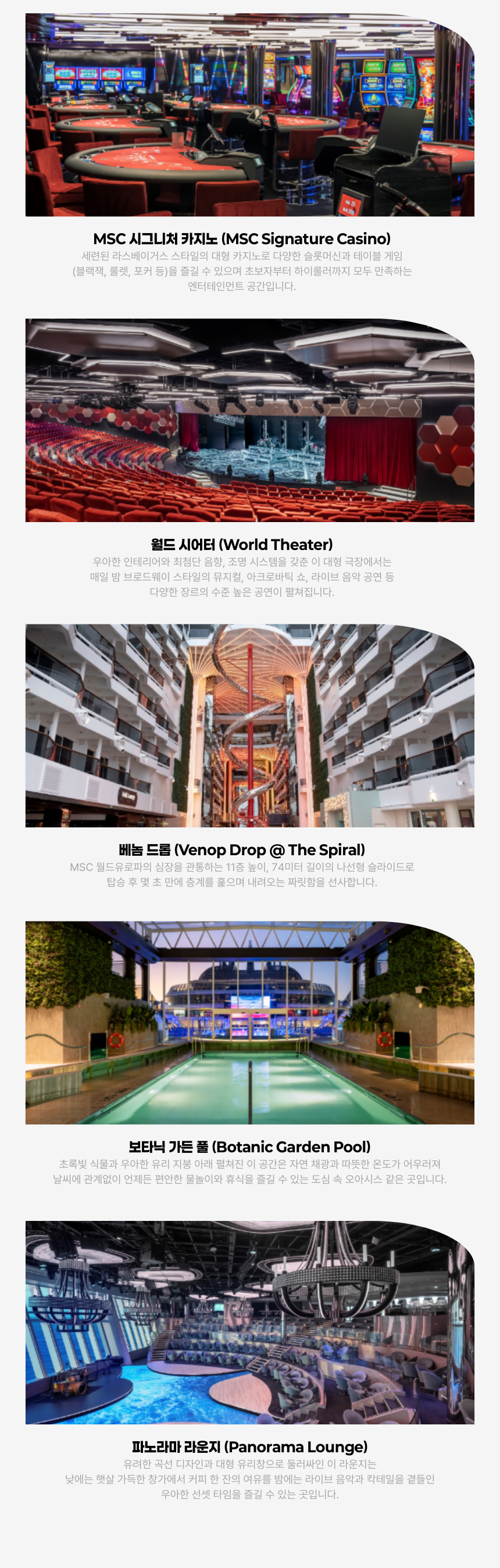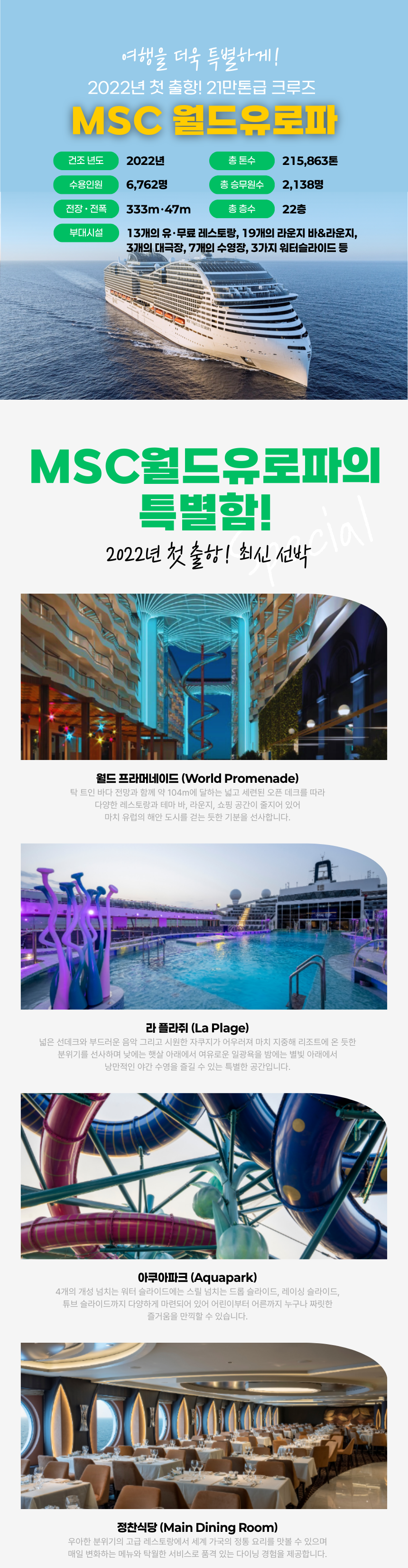 그리고 이 여행의 또 다른 주인공은 바로 MSC 월드유로파입니다. 약 21만 톤 규모의 최신 초대형 크루즈로, 지중해 크루즈 중에서도 가장 현대적인 시설과 디자인을 갖춘 선박입니다. 선내에는 다양한 레스토랑과 쇼, 수영장과 스파, 워터슬라이드, 산책로 등이 마련되어 있어 이동하는 시간마저 여행의 일부가 됩니다.